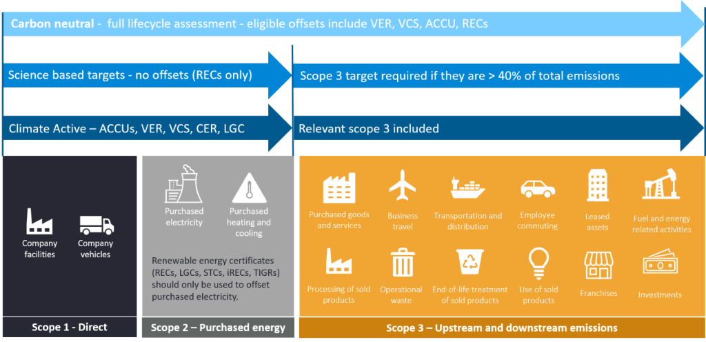 The diagram provided below visually represents the various emission categories within the GHG Protocol Corporate Standard for Scope 1 and 2 and the Corporate Value Chain Standard for Scope 3, along with their respective considerations within various recognized schemes.