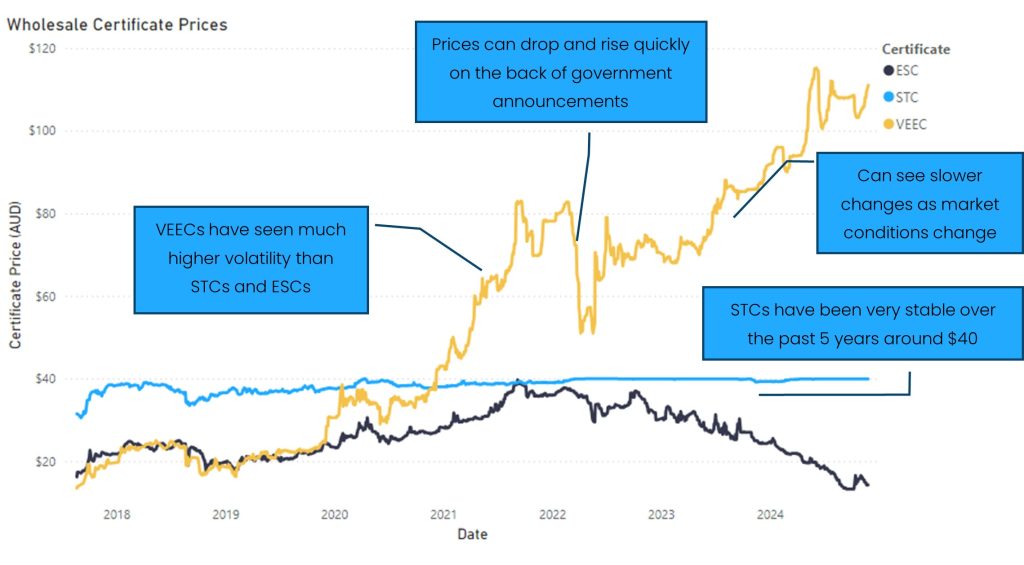 Looking at 3 different market-based incentive programs – Victorian Energy Upgrades Program (VEECs), NSW Energy SavingsElectricity or gas savings or both. Scheme (ESCs), and the Small-Scale Renewable Energy Target (STCsSmall-scale Technology Certificate under the Australian Renewable Energy Target. More), you can see that the government policy and market conditions have led to 3 very different outcomes in certificate pricing over the past 6 years
