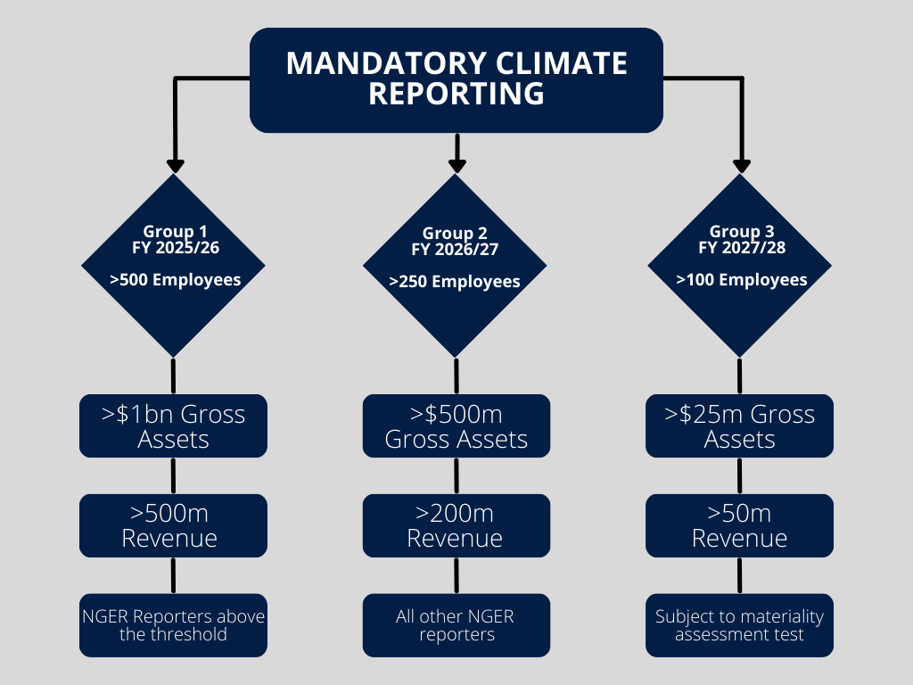 Rollout: Starting with Group 1 in FY 2025/26, Australia’s mandatory climate reporting will be phased in, covering companies with over 500 employees, followed by Group 2 in FY 2026/27 for companies with more than 250 employees, and finally, Group 3 in FY 2027/28 for those with over 100 employees. This rollout will apply to organizations based on their gross assets, revenue, and employee count, ensuring comprehensive climate-related financial disclosures.