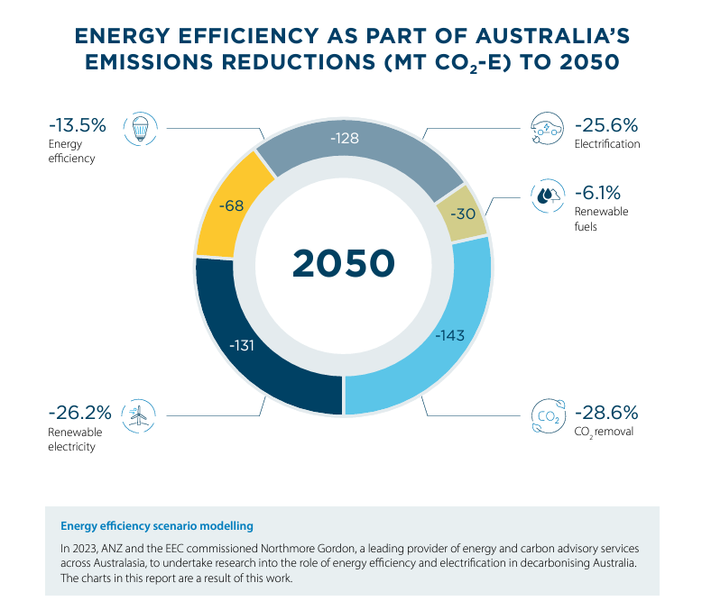 - Impactful Modelling: Independent analysis by Northmore Gordon, commissioned by ANZ and the EEC, finds energy efficiency can deliver up to 18.5% of the needed emissions reduction by 2030.