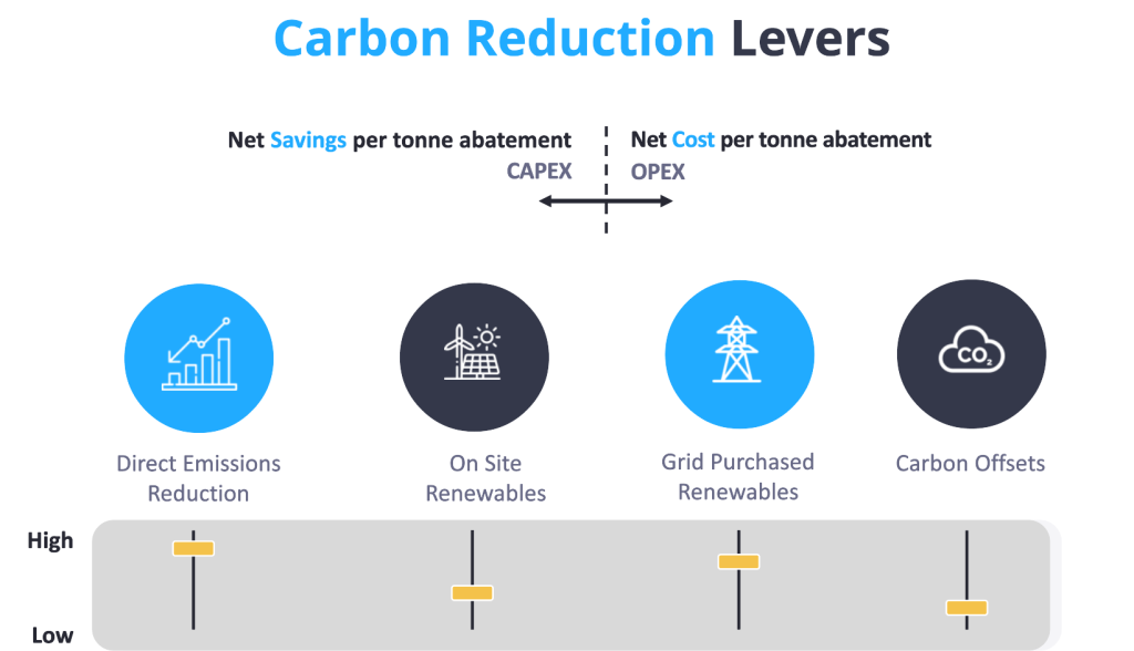 For any business, there are four typical ‘Carbon Reduction Levers’ available to decarbonise its operations. The availability of these levers differs from site to site, company to company. No one-size-fits-all.