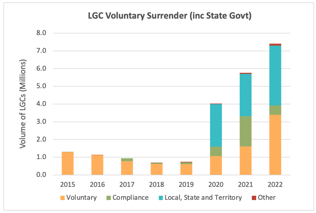 The rate of voluntary surrender against the programs is growing rapidly; in 2022 almost 8 million LGCs were voluntarily retired.